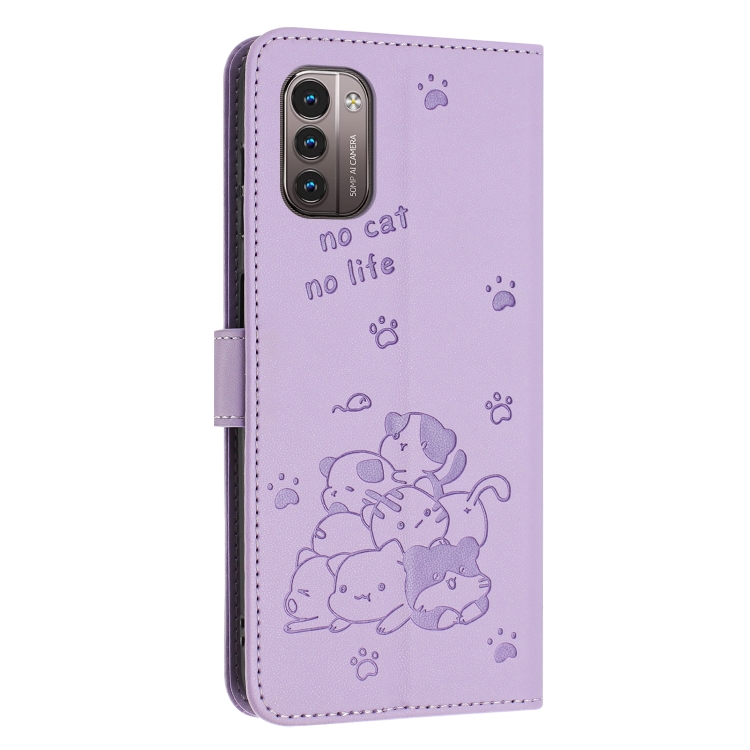 Funda de Cuero para Nokia G11/G21 con Diseño de Gatito en Relieve y Cordón (Morado)