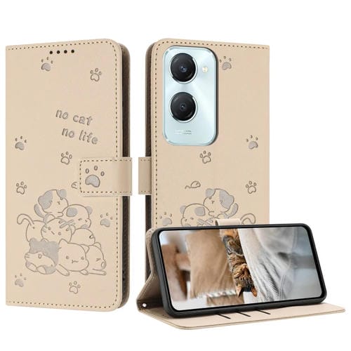 Funda de Piel con Diseño de Gatito En Relieve y Cordón para Vivo Y03 4G / Y18 / Y18E (Beige)