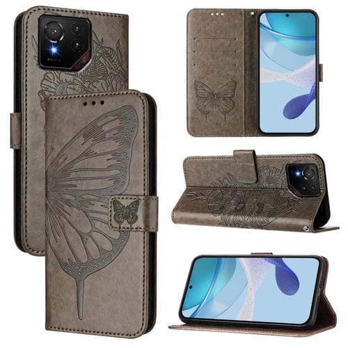 Funda de Cuero Asus Rog Phone 9/9 Pro con Diseño de Mariposa en Relieve (Gris)