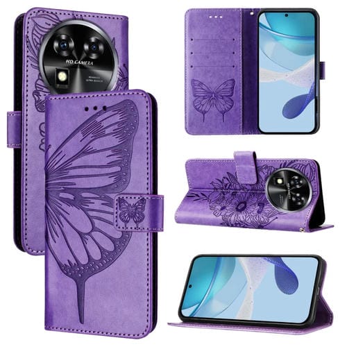 Funda de Cuero para Oukitel C37 con Diseño de Mariposa en Relieve (Morado)
