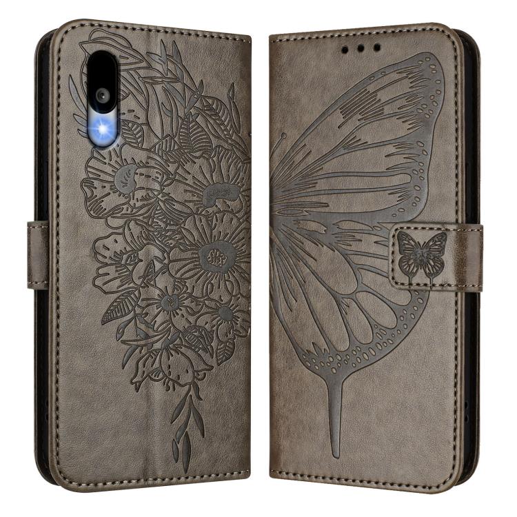 Funda de Cuero para Sharp Basio Active3 con Diseño de Mariposa en Relieve (Gris)
