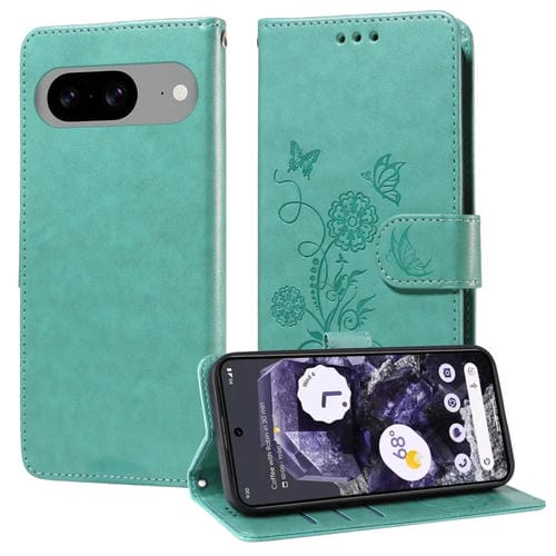 Funda de Cuero Google Pixel 8 con Diseño de Mariposas y Flores en Relieve (Verde)