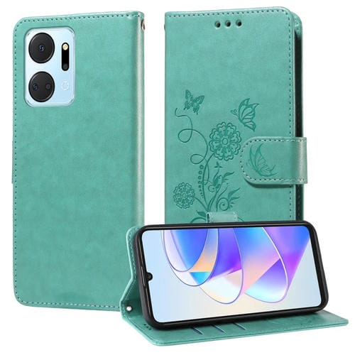 Funda de Cuero Honor X7A 4G Play 7T con Diseño Mariposas y Flores en Relieve (Verde)