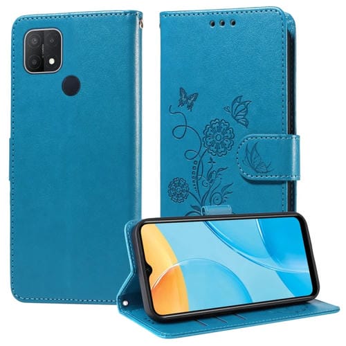Funda de Cuero con Diseño de Mariposas y Flores En Relieve para Oppo A15 4G India/A15S/A16K/A16E (Azul)