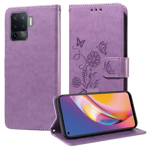 Funda de Cuero con Diseño de Mariposas y Flores En Relieve para Oppo A94 4G/5G/A95 5G/F19 Pro (Morado)