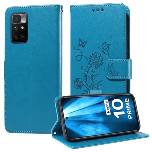 Funda de Cuero con Diseño de Mariposas y Flores En Relieve para Redmi 10 2022/10 Prime (Azul)