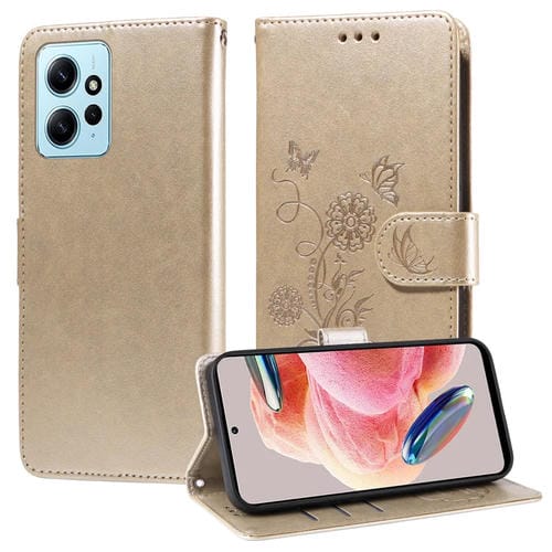 Funda de Cuero con Diseño de Mariposas y Flores En Relieve para Redmi Note 12 4G (Dorada)