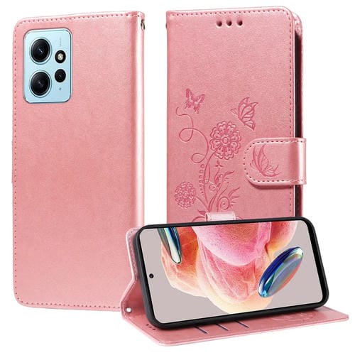 Funda de Cuero con Diseño de Mariposas y Flores En Relieve para Redmi Note 12 4G (Oro Rosa)