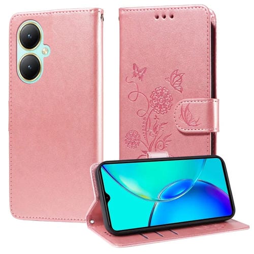 Funda de Cuero con Diseño de Mariposas y Flores En Relieve para Vivo Y35M+ / Y35+ / Y27 4G (Oro Rosa)