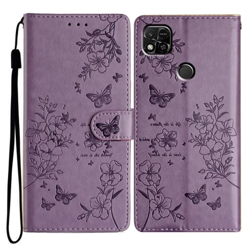 Funda de Cuero con Diseño de Mariposas y Flores para Redmi 9C (Morado)
