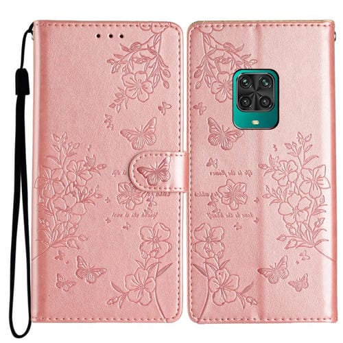 Funda de Cuero con Diseño de Mariposas y Flores para Redmi Note 9 Pro (Oro Rosa)