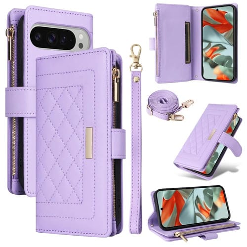 Funda de Cuero con Diseño de Rombos y Billetera Cruzada con Cremallera para Google Pixel 9 Pro XL (Morado)