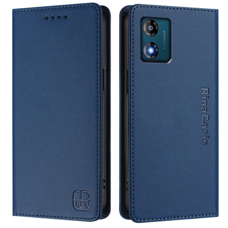 Funda de Cuero con Doble Pliegue y Succión Magnética Rfid para Motorola Moto E13 Rc01 (Azul Oscuro)