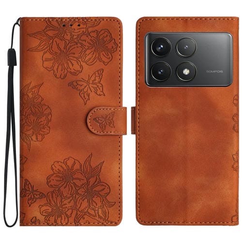 Funda de Cuero con Estampado de Flores y Mariposas para Xiaomi Poco F6 Pro (Marrón)