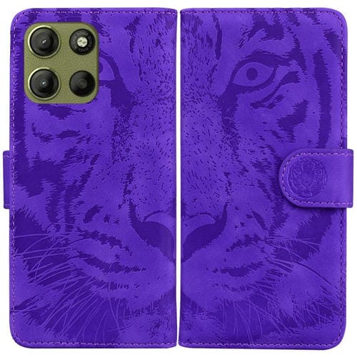 Funda de Cuero con Estampado de Tigre para Motorola Moto G15 (Morado)