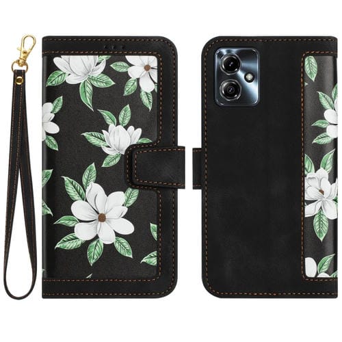 Funda de Cuero con Estampado Floral y Cordón para Motorola Moto G14 (Negro)