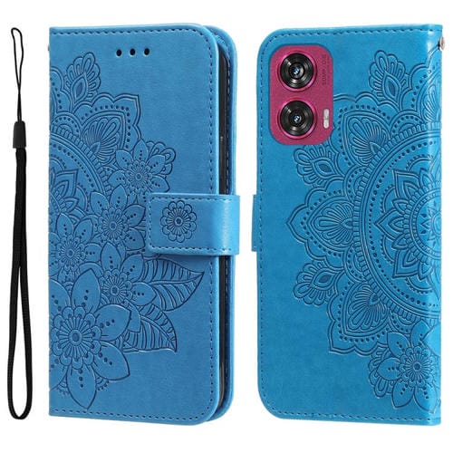 Funda de Cuero Motorola Edge 50 Fusion con Relieve de Flores de Siete Pétalos (Azul)
