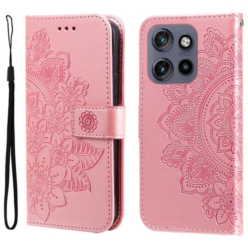 Funda de Cuero con Relieve Flores Siete Pétalos para Motorola Edge 50 Neo Thinkphone 25 (Oro Rosa)