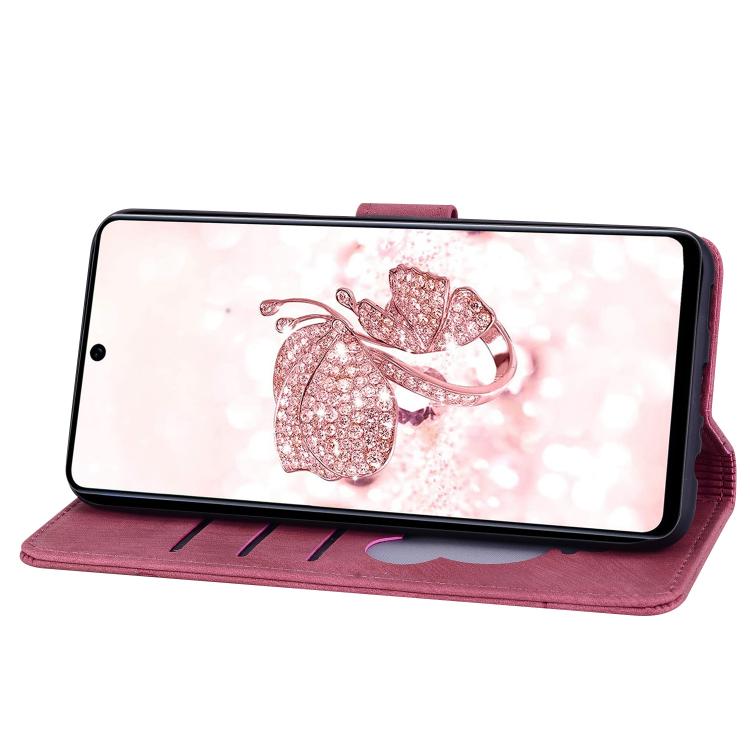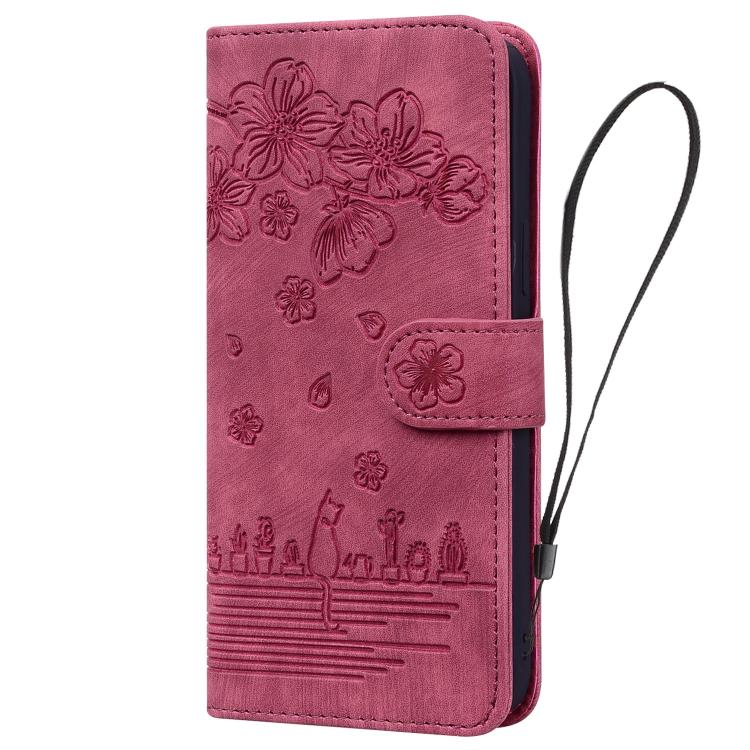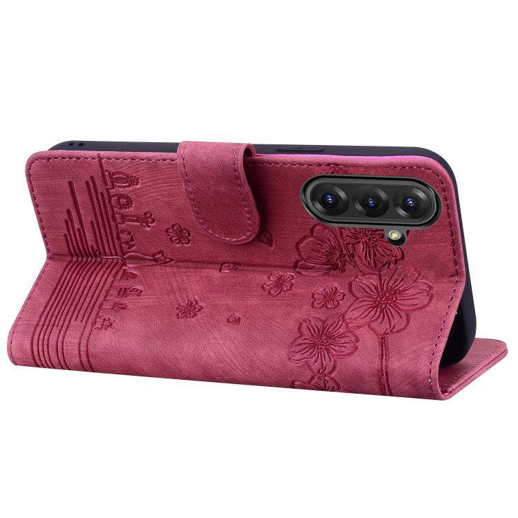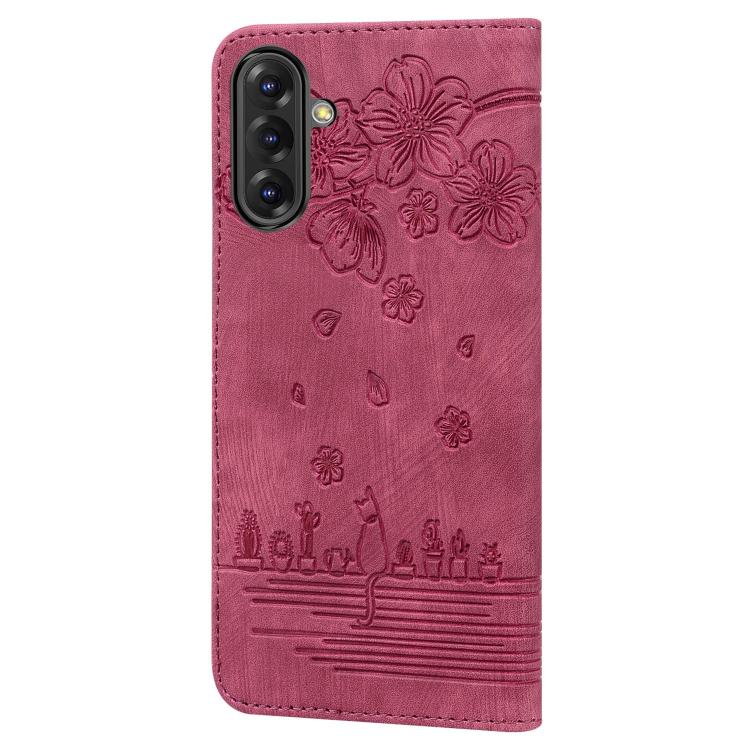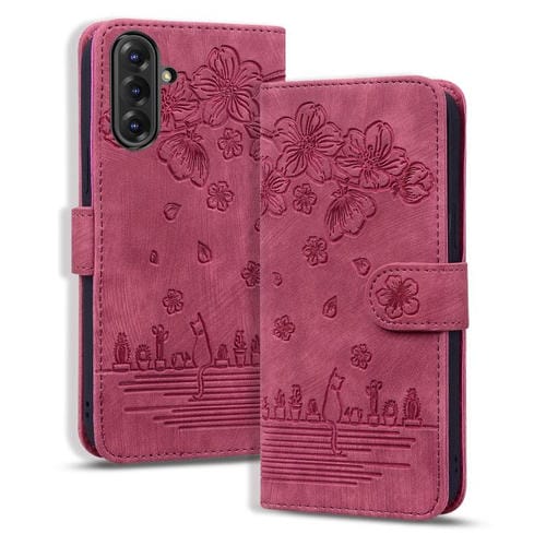 Funda de Piel con Relieve de Gato Sakura para Samsung Galaxy A56/A36 (Rojo Vino)