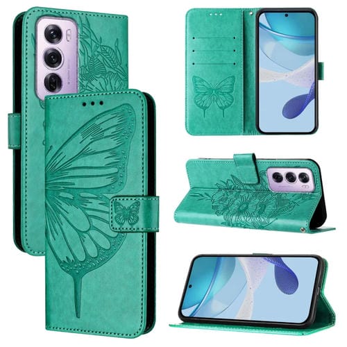 Funda de Cuero con Relieve de Mariposa para Teléfono Oppo Reno12 Pro 5G (Verde)