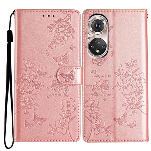 Funda de Cuero Huawei P50 Pro con Relieve de Mariposa y Flor (Oro Rosa)