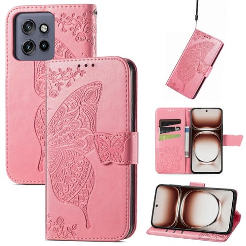 Funda de Cuero con Relieve Mariposa y Flor para Motorola Edge 50 Neo (Rosa)