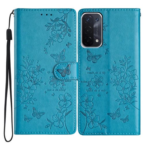 Funda de Cuero con Relieve de Mariposa y Flor para Oppo A74 5G/A54 5G (Azul)