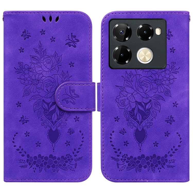 Funda de Cuero con Relieve Mariposa y Rosa para Infinix Note 40 Pro 4G/5G (Morado)