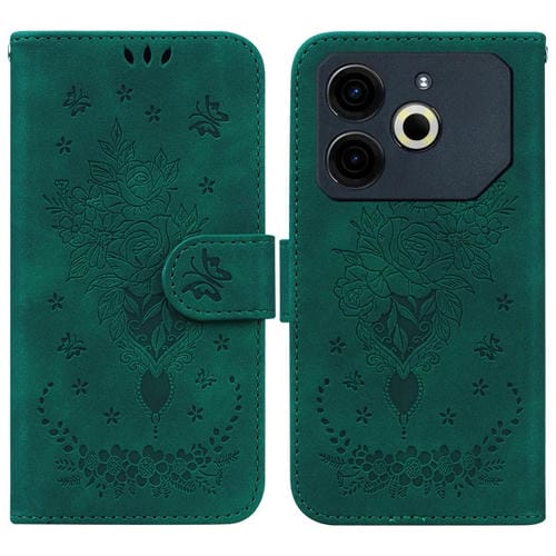 Funda de Cuero con Relieve Mariposa y Rosa para Tecno Pova 6 Neo (Verde)