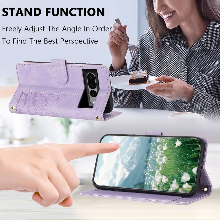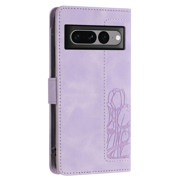 Funda de Cuero con Relieve de Tulipanes para Google Pixel 7 Pro con Cordón (Morado)