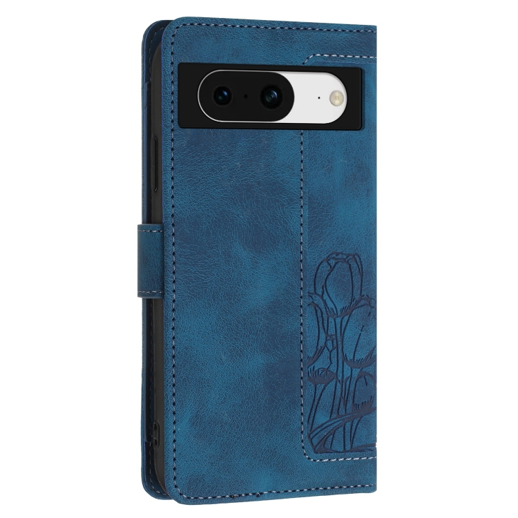 Funda de Cuero con Relieve de Tulipanes para Google Pixel 8 con Cordón (Azul)