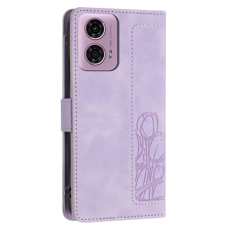 Funda de Cuero con Relieve de Tulipanes para Motorola Moto G24 con Cordón (Morado)