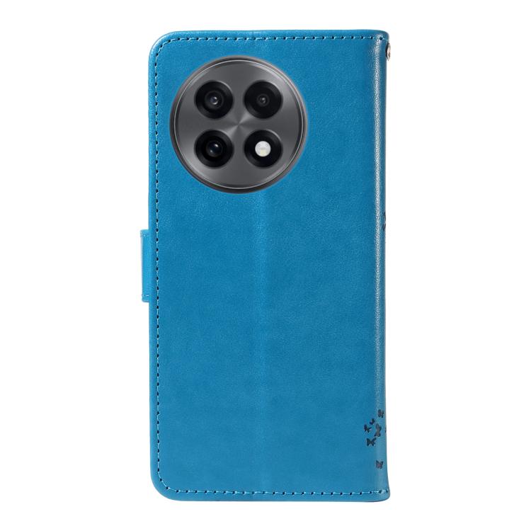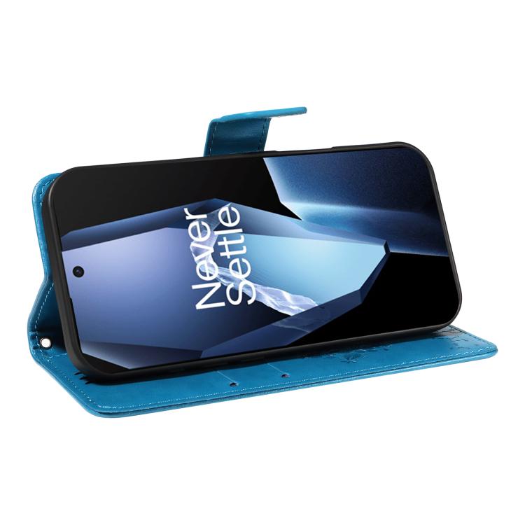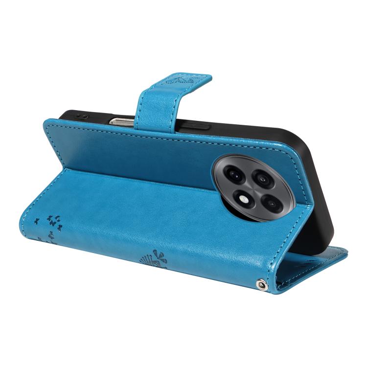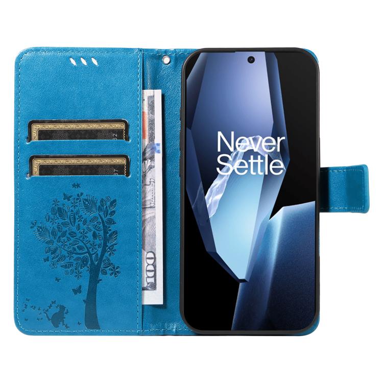 Funda de Cuero con Tapa para OnePlus 13R Global con Diseño de Árbol y Gato en Relieve (Azul)