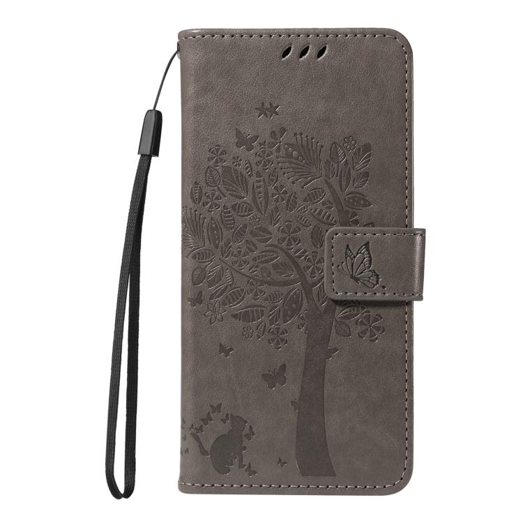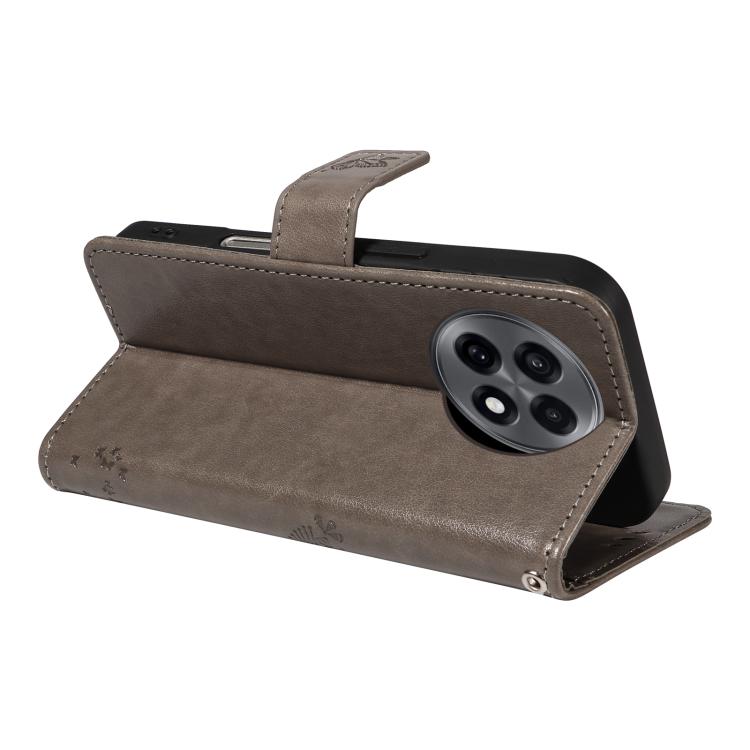 Funda de Cuero con Tapa para OnePlus 13R Global con Diseño de Árbol y Gato En Relieve (Gris)