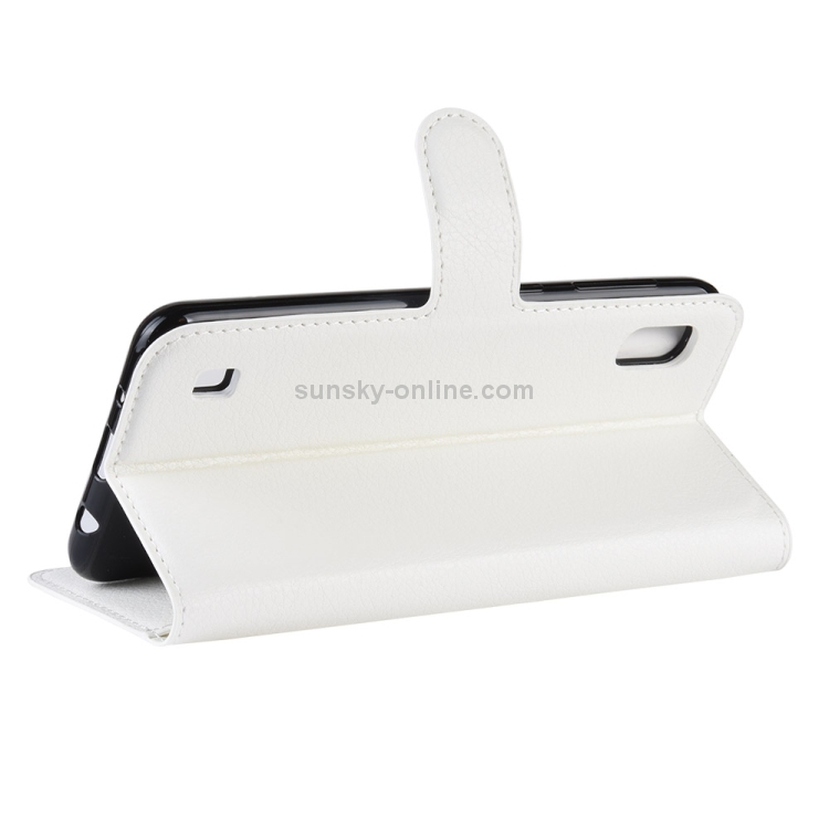 Funda de cuero con tapa horizontal con textura Litchi para Galaxy A10, con billetera, soporte y ranuras para tarjetas (blanco)