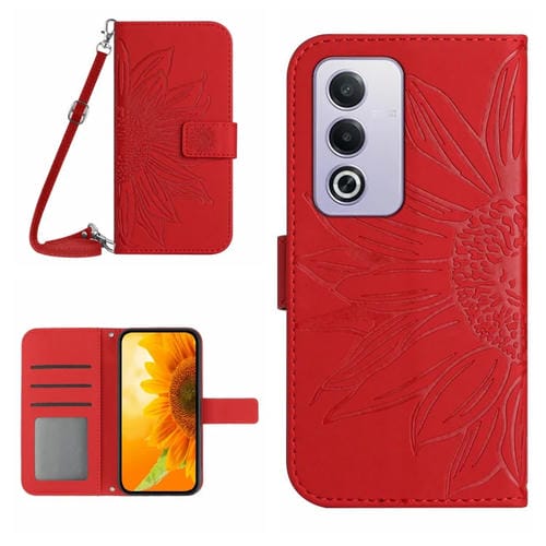 Funda de Cuero con Tapa para Teléfono Oppo A3 Pro 5G India/K12X 5G Global con Diseño de Girasol En Relieve y Cordón (Rojo)