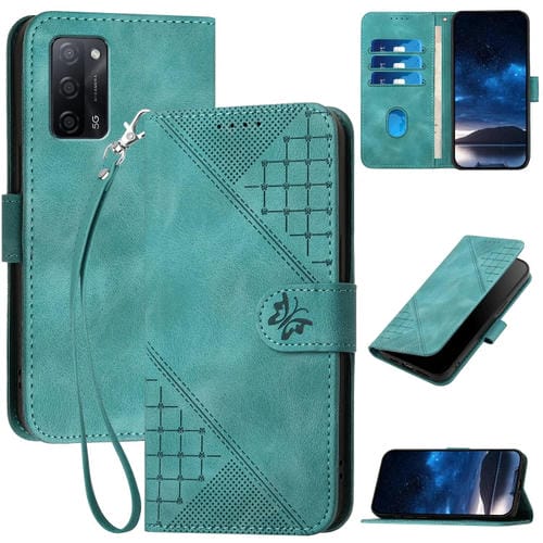 Funda de Cuero con Tapa y Cordón para Oppo A54 4G/A16 Yx0080 con Diseño En Relieve de Mariposa y Cuadrícula (Azul Claro)