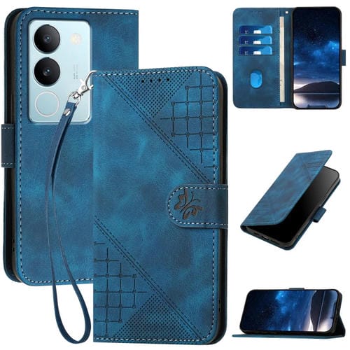 Funda de Cuero con Tapa y Cordón para Vivo V29 5G Global Yx0080 con Diseño En Relieve de Mariposa y Cuadrícula (Azul Oscuro)