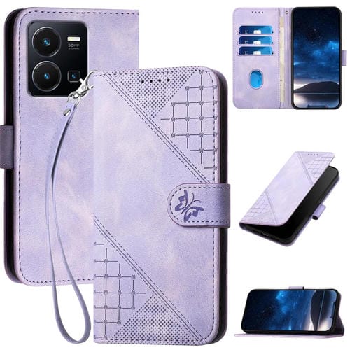 Funda de Cuero con Tapa y Cordón para Vivo Y77E 5G Yx0080 con Diseño En Relieve de Mariposa y Cuadrícula (Morado Claro)