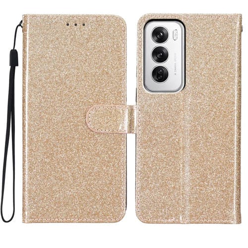 Funda de Cuero con Tapa y Purpurina para Oppo Reno12 Global (Dorada)