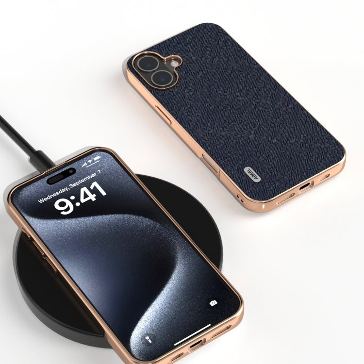 Funda de Cuero Genuino Abeel para iPhone 16 con Textura Cruzada y Marco Galvanizado (Azul)