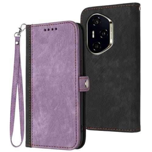 Funda de Cuero para Honor 300 Pro y Honor 300 Ultra con Correa de Mano Plegable y Hebilla Lateral Doble (Morado)