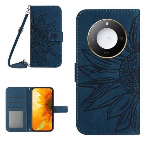 Funda de Cuero para Honor X9C con Diseño de Flores y Sol y Cordón (Azul Tinta)