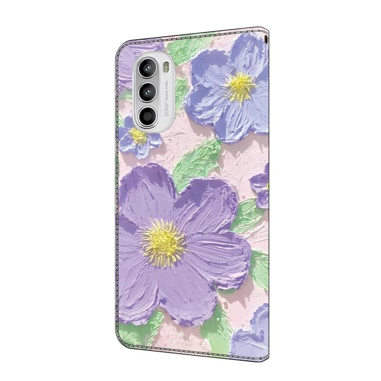 Funda de Cuero Pintada a Mano Motorola Moto G52 con Pintura al Óleo Flores Moradas