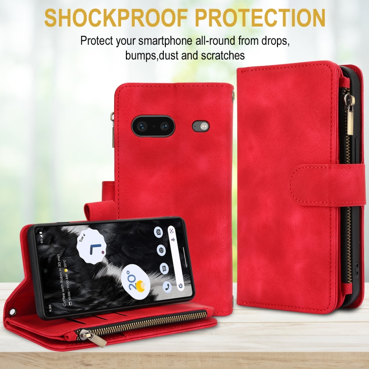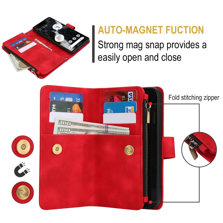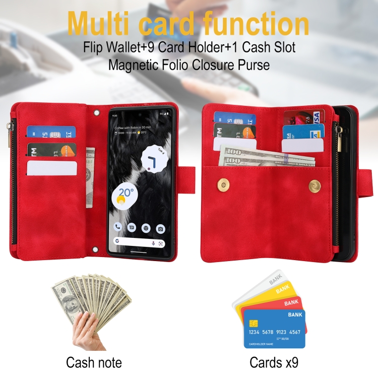 Funda de Cuero Rfid con Cremallera para Google Pixel 7 Dream con 9 Tarjetas y Cordón (Rojo)