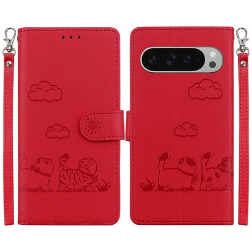 Funda de Cuero Rfid para Google Pixel 9 y 9 Pro con Diseño de Gatos (Roja)