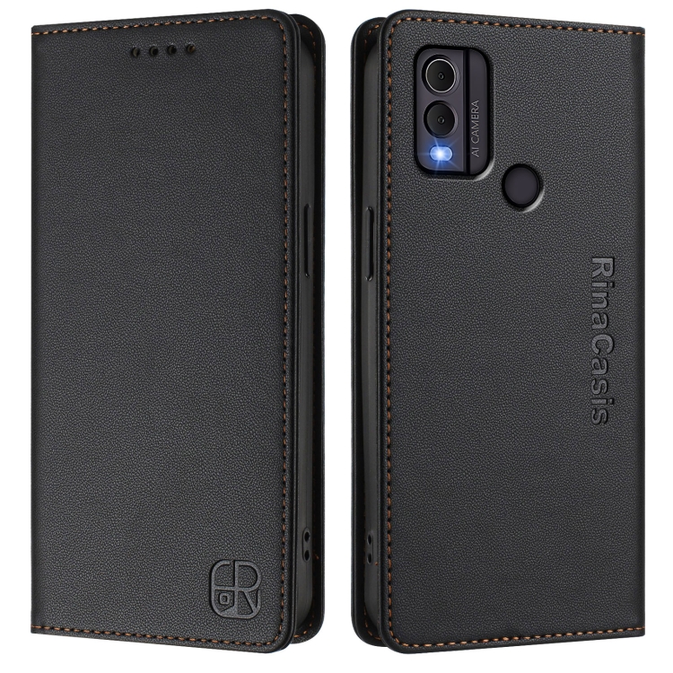 Funda de Cuero Rfid con Doble Pliegue y Succión Magnética para Nokia C22 Rc01 (Negra)