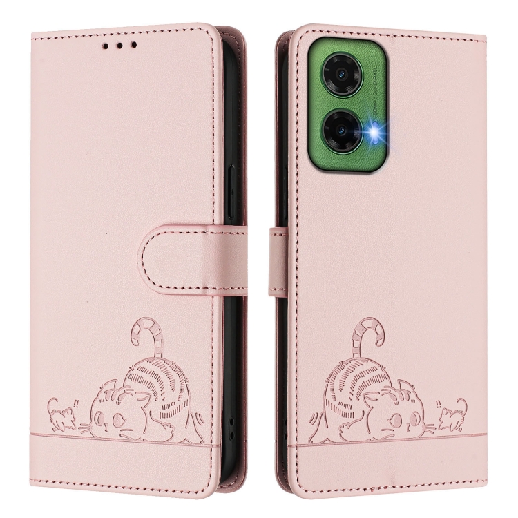 Funda de Cuero Rfid Motorola Moto G35 con Estampado de Rata y Gato en Relieve y Cordón (Rosa)