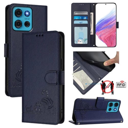 Funda de Cuero Rfid para Motorola Moto G75 con Estampado de Rata y Gato en Relieve y Cordón (Azul)