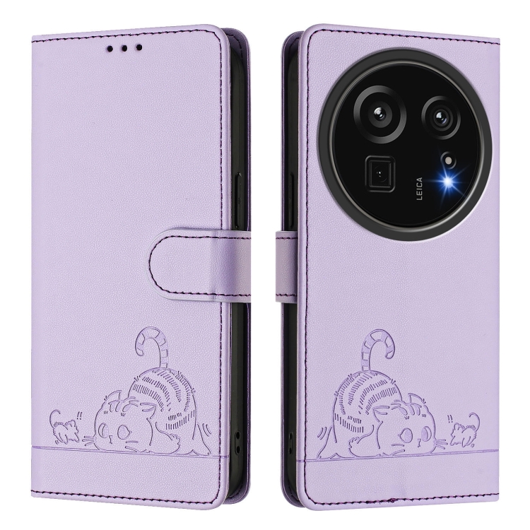 Funda de Cuero Rfid para Sharp Aquos R9 Pro con Estampado de Rata y Gato En Relieve y Cordón (Morado)